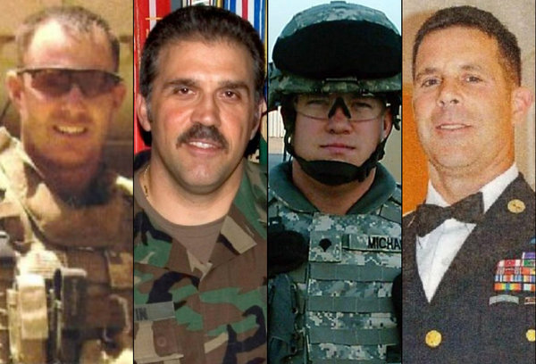 This combination of undated family photos provided by the Show of Support, Hunt for Heroes committee show, from left: Sgt. Maj. Gary Stouffer, 37; Sgt. Maj. Lawrence Boivin, 47; Army Sgt. Joshua Michael, 34, and Sgt. Maj. William Lubbers, 43, four veterans killed when a parade float they were riding on was struck by a freight train at a crossing Thursday, Nov. 15, 2012, in Midland, Texas. (AP Photo/Courtesy Show Of Support) ** Usable by LA and DC Only **